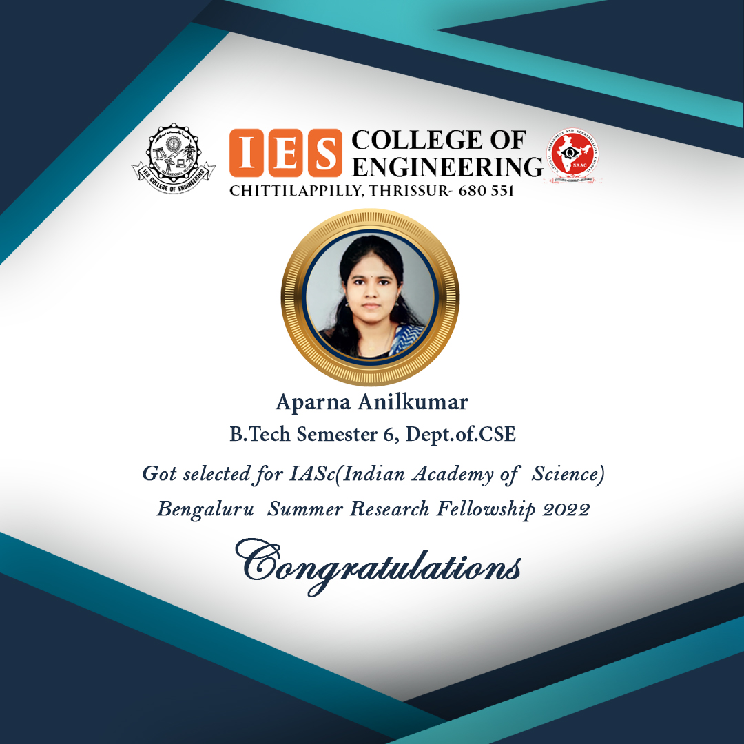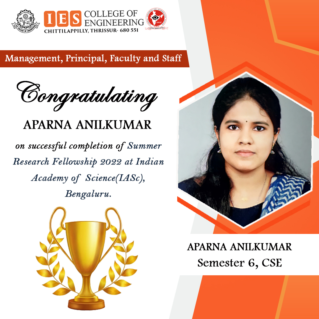 View MoreAparna Anilkumar, B.Tech Semester 6, Dept.of.CSE got selected for IASc(Indian Academy of Science) Bengaluru Summer Research Fellowship 2022.
