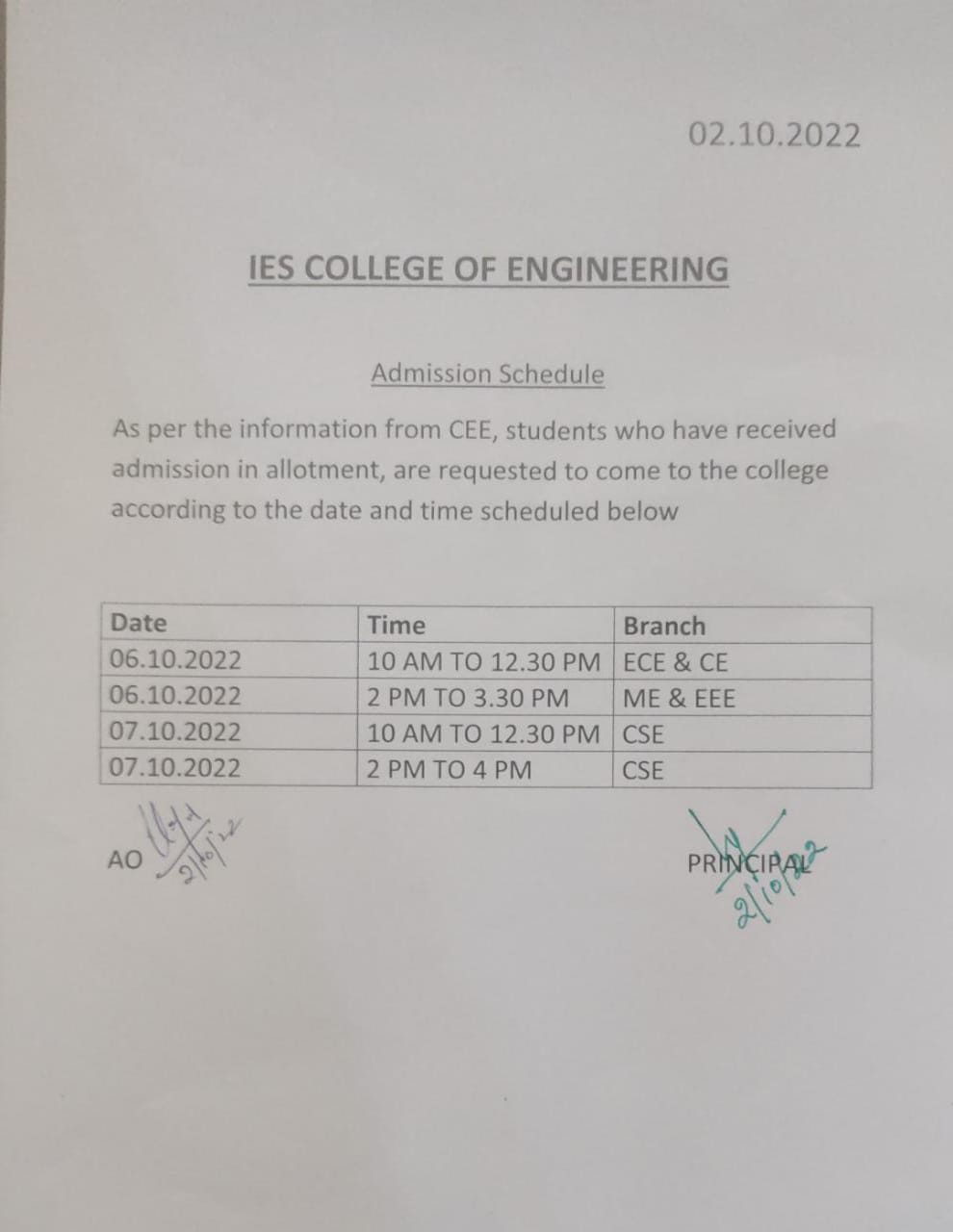 View MoreAs per the information from CEE, students who have received admission in allotment, are requested to come to the college according to the date and time scheduled below: