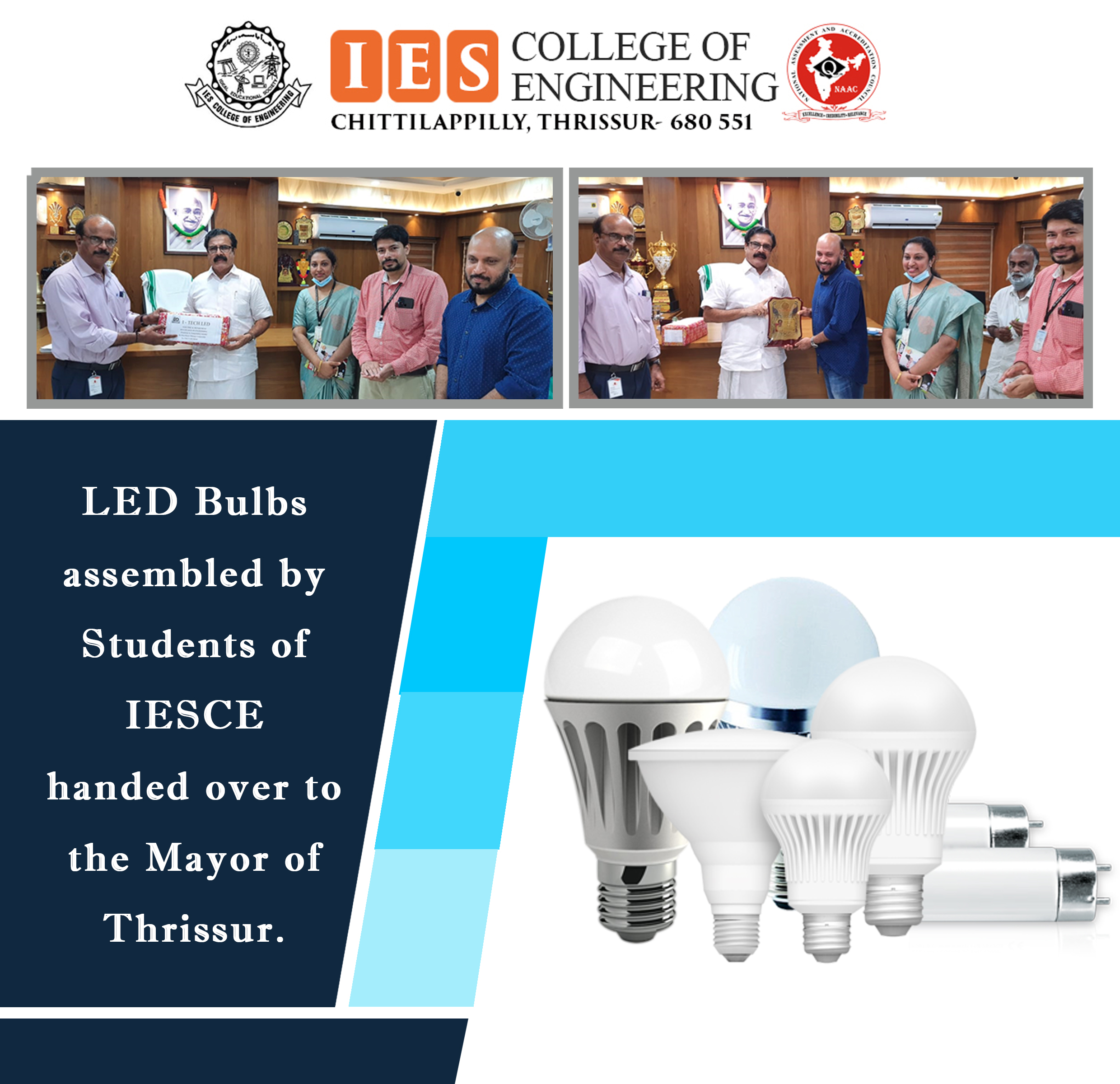 View MoreLED Bulbs assembled by Students of IESCE, handed over to the Mayor of Thrissur Shri. M.K. Varghese, in the presence of Mr. Mohammed Rafeek, General Secretary of IESCE, College Principal Dr.S. Brilly Sangeetha and Dr. John Chembukkavu HOD of EEE Department.